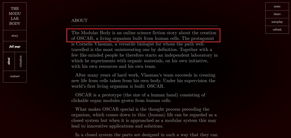 Medya, laboratuvar testleri, Vlasman’ın geçmişi, tasarım süreci, üretim süreci, modüler sitemin açıklanması ve laboratuvar özellikleri olmak üzere 7 alt başlık altında kategorize edilmiş videolar hangi ucundan başlarsanız başlayın sizi OSCAR’ın hikayesini bir haber bültenindeymişcesine takip etmenize olanak veriyor. Yapımcı ekip tarafından modern bir Frankenstein hikayesi olarak tanımlanan hikayede günümüz biyo-mühendislerine de; “Kök hücreler şu güne kadar şimdiki organlarımızın yerini alacak yeni organlar üretmek için kullanıldı ama biz bu fırsatı insanoğlunu olduğu gibi sürdürmektense onu yeniden tanımlamak için kullanacağız.” denilerek profesyonel anlamda çok samimi bir taş atılıyor.