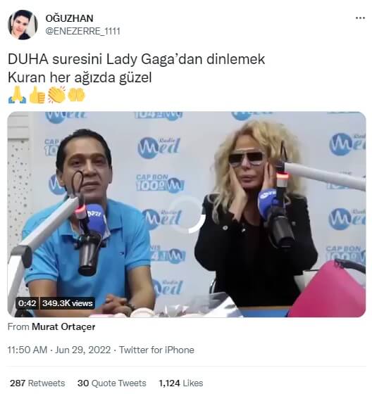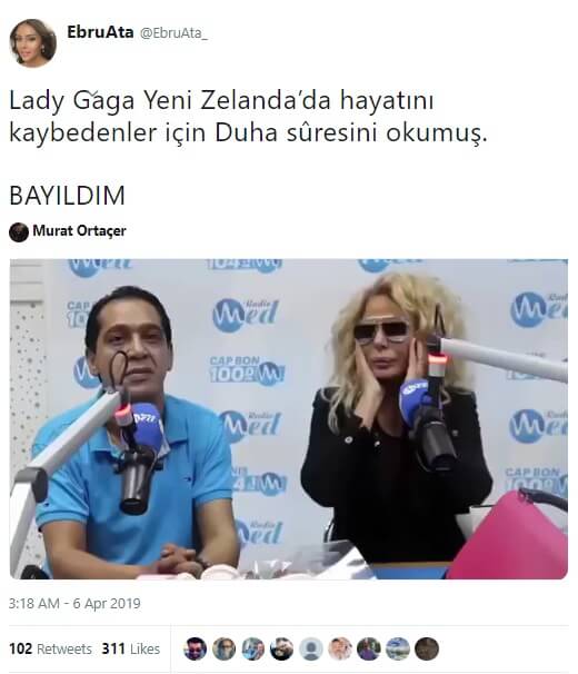 “Uçuk kaçık halleriyle bildiğimiz Lady Gaga Yeni Zelanda’da hayatını kaybedenler için Kuran okumuş. Duha suresini Abdussamed’den çalışmış 😊”