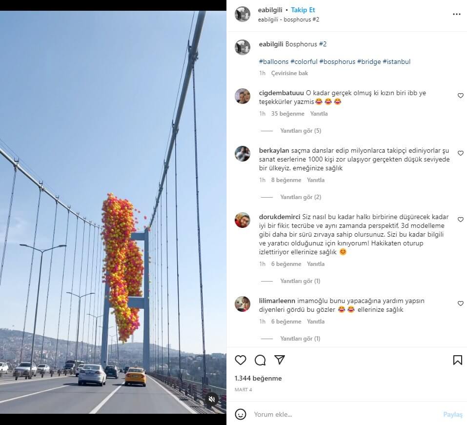 Daha önce, yine Emir Ahmet Bilgili’nin 15 Temmuz Şehitler (Boğaziçi) Köprüsü’ne renkli balonları görsel efektle yerleştirdiği video sosyal medyada “Ekrem İmamoğlu 8 Mart için yapmış bu gerçek mi” ifadesiyle paylaşılmıştı.
