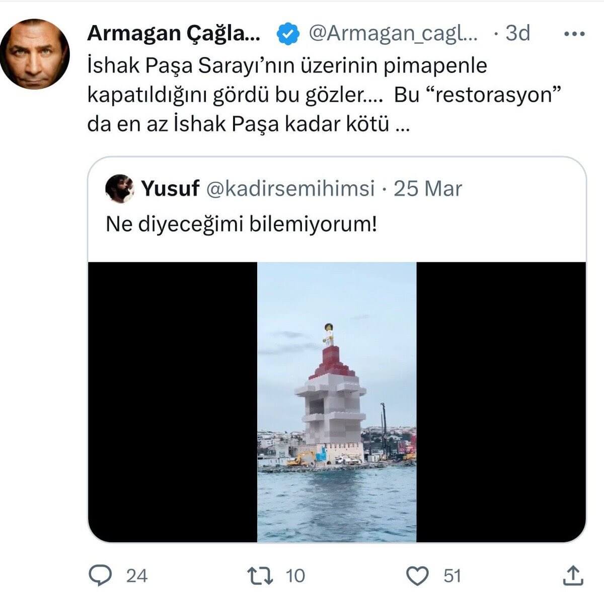 “2500 yıllık geçmişi olan güzelim kız kulesinin yeni hali bu. Müteahhitin kendi bahçesine yaptırdığı barbekü gibi olmuş.”