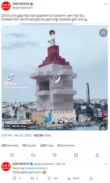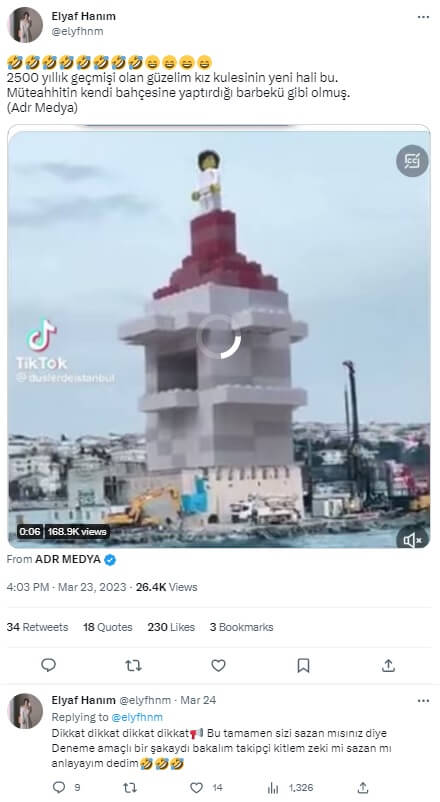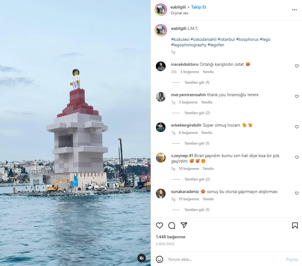 Bilgili’nin hazırladığı videoyu “#kızkulesi #üsküdarsahil #istanbul #bosphorus #lego #legophotography #legofan” etiketleriyle aktardığı 23 Mart 2023 tarihli paylaşımı şöyle: