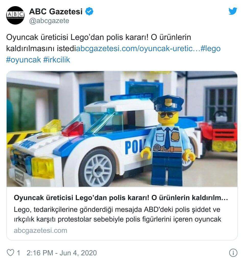 ABD’nin Minneapolis kentinde George Floyd adlı Afrikalı Amerikalı vatandaşın görevden uzaklaştırılan polisler tarafından öldürülmesi akabinde yaşanan protesto olaylarının etkisiyle Lego adlı ünlü oyuncak firmasının polis memurlarının, itfaiyecilerin, suçluların, acil durum taşıtlarının ve binaların temsilini içeren aksesuarları satıştan kaldırdığı iddiası sosyal medyaya ve haber platformlarına yansıdı.