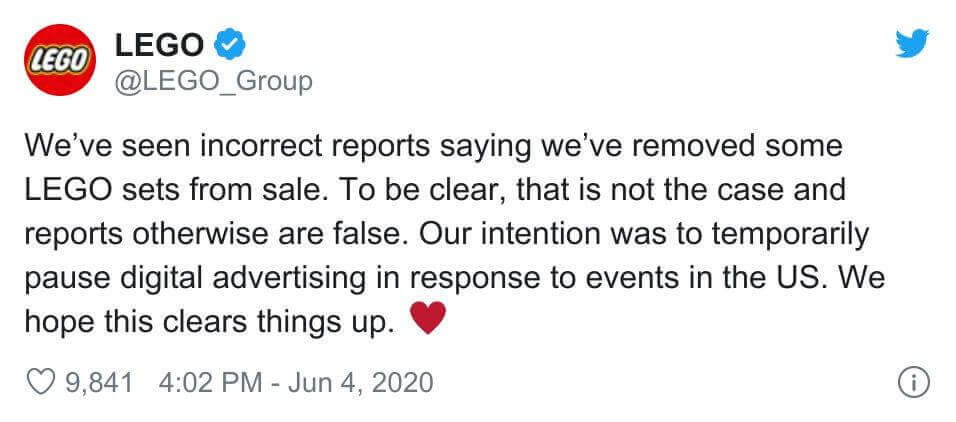“We’ve seen incorrect reports saying we’ve removed some LEGO sets from sale. To be clear, that is not the case and reports otherwise are false. Our intention was to temporarily pause digital advertising in response to events in the US. We hope this clears things up.”