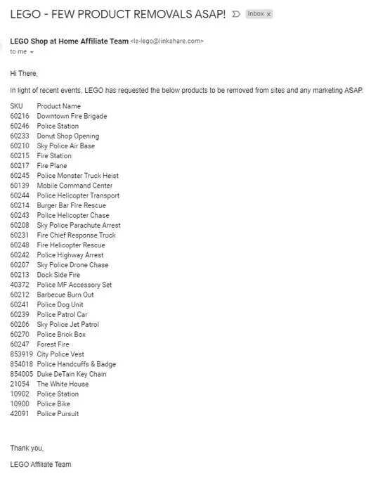 Ancak dünyanın en büyük oyuncak firmalarından Lego, polis temalı ürünlerin satışını değil promosyonlarını ve reklamlarını durdurdu. Lego, tedarikçilerine gönderdiği bir mesaj ile ABD’deki protestolar sebebiyle polis figürleri ve Beyaz Saray oyuncak setlerinin internet üzerinden promosyonlarının ve reklamlarının kaldırılmasını istemişti.