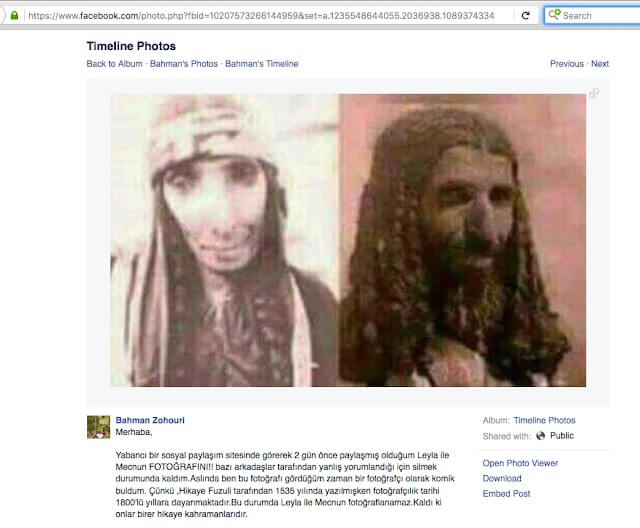 Bu yanlış algının ülkemizde yaygınlaşmasına yol açan kişi fotoğraf sanatçısı Bahman Zohouri olmuştu. Zohouri’nin 2015 yılında Facebook sayfasında “Leyla ile Mecnun” notuyla paylaştığı iki eski fotoğraf zaman içerisinde gerçekten Leyla ile Mecnun’a ait olduğu sanılarak paylaşılmaya başlanmıştı.
