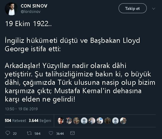 Lloyd George’un Atatürk Hakkında “İnsanlık Tarihi Birkaç Yüzyılda Bir Dahi Yetiştirebiliyor. Şu Talihsizliğimize Bakınız Ki Küçük Asya’da Çıktı. Hem De Bize Karşı.. Elden Ne Gelebilirdi?” Dediği İddiasını İçeren Tweet
