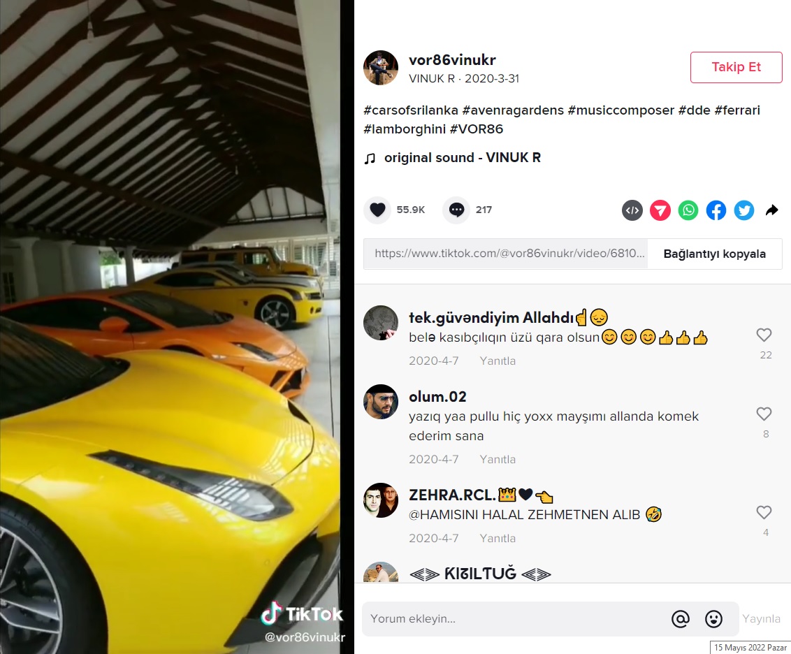 Lüks otomobillerin görüldüğü ilk bölümün 31 Mart 2020 tarihinde vor86vinukr uzantılı TikTok profili tarafından, yanan araç görüntülerinin ise 10 Mayıs 2022 günü “Pahan Sankalpa” adlı kullanıcı tarafından “avenragardens” etiketiyle TikTok’ta paylaşıldığı anlaşılıyor.