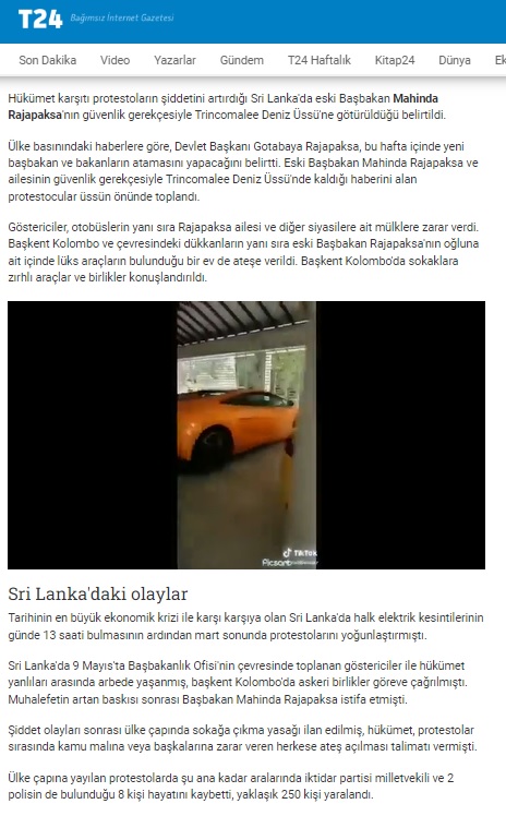 “Ülkede arabalar otobüsler ve başbakan Mahinda Rajapaksa’nın evi ateşe verildi. Devam eden protestolar da bu sefer hedef Sri Lanka Başbakanının oğlunun lüks otomobilleri oldu…”