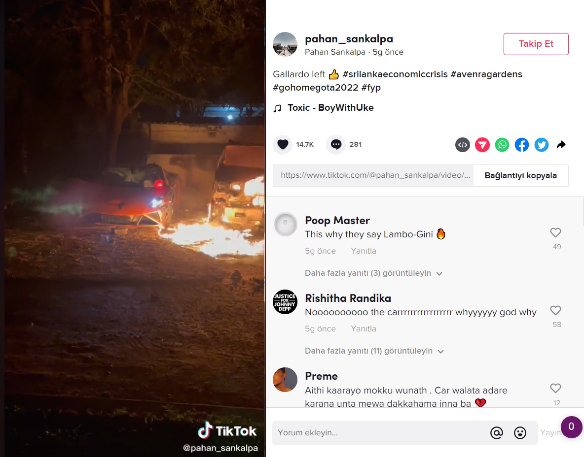 Bu süreçte, Sri Lanka Başbakanı Rajapaksa’nın oğlunun lüks otomobillerinin protestocular tarafından yakıldığı ana ait olduğu sanılarak bir videonun paylaşıldığı görüldü.