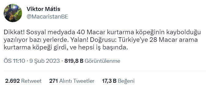 “Dikkat! Sosyal medyada 40 Macar kurtarma köpeğinin kaybolduğu yazılıyor bazı yerlerde. Yalan! Doğrusu: Türkiye’ye 28 Macar arama kurtarma köpeği girdi ve hepsi iş başında”