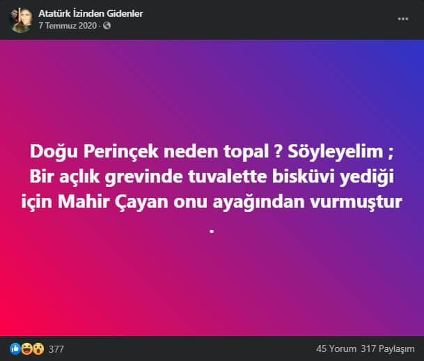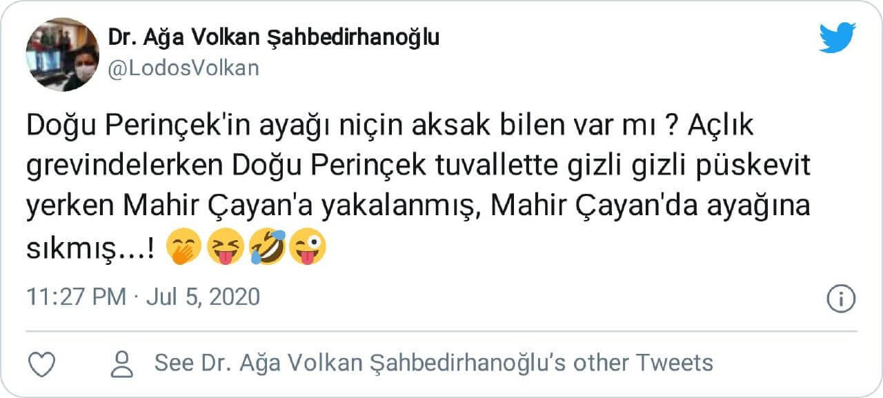 “Doğu Perinçek neden topal ? Söyleyelim; Bir açlık grevinde tuvalette bisküvi yediği için Mahir Çayan onu ayağından vurmuştur ..”