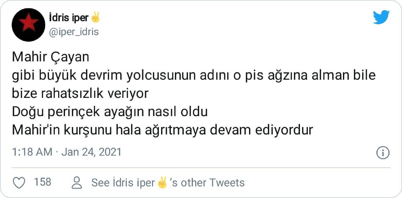“Mahir Çayan gibi büyük devrim yolcusunun adını o pis ağzına alman bile bize rahatsızlık veriyor Doğu perinçek ayağın nasıl oldu Mahir’in kurşunu hala ağrıtmaya devam ediyordur”