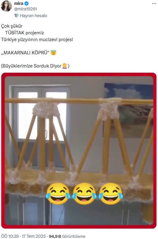mira (@mira19261): “Çok şükür TÜBİTAK projemiz Türkiye yüzyılının mucizevi projesi ,,MAKARNALI KÖPRÜ” (Büyüklerimize Sorduk Diyor♀️)”