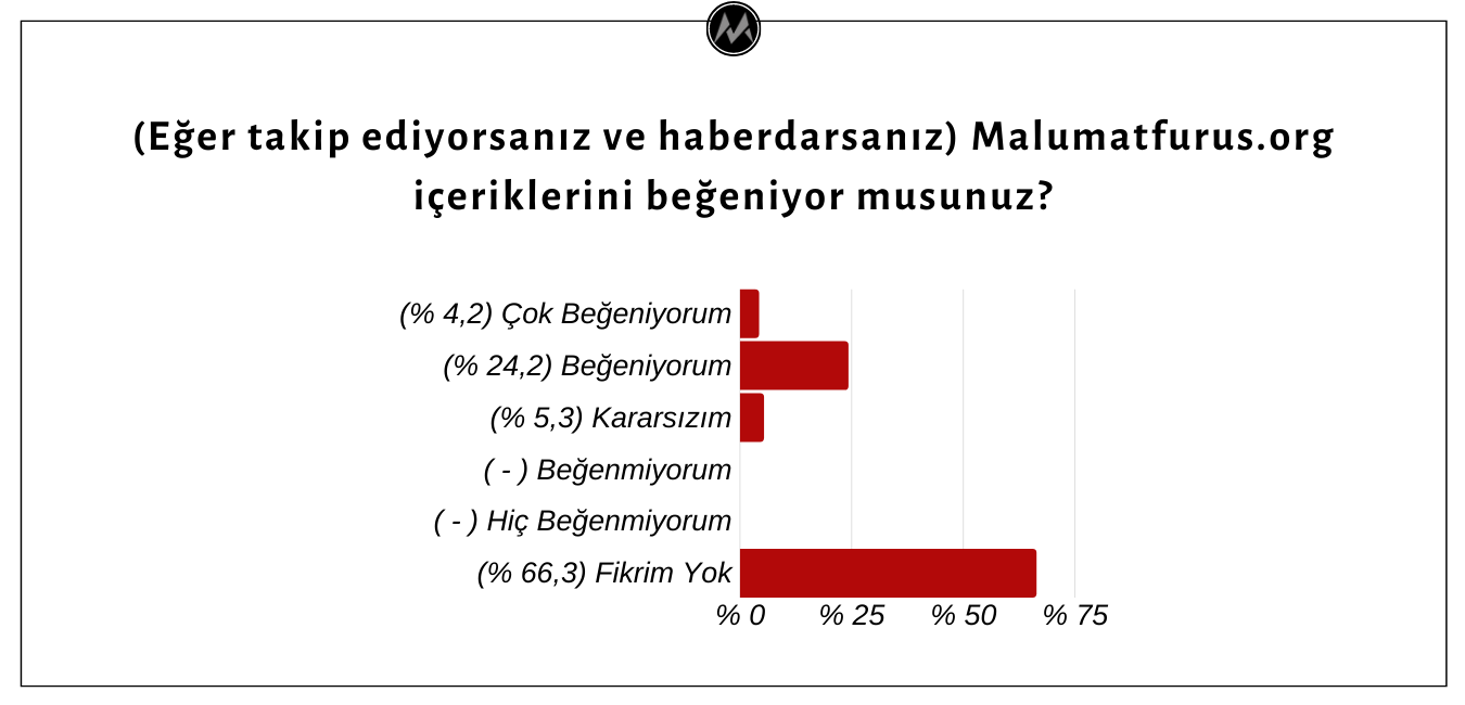 Anketin sonraki safhasında Malumatfurus.org’u takip ettiğini ve girişimin çalışmalarından haberdar olduğunu belirten katılımcılara yayınlanan içerikler hakkında görüşleri sorulmuştur. Soruya yanıt veren köşe yazarlarının hiçbirinin yayınlanan incelemeleri beğenmediklerini, 28,4’ünün incelemeleri beğendiklerini belirttiği görülmekle birlikte, çoğunluğunun (% 66,3) içerikler hakkında bir fikirlerinin bulunmadığını, küçük bir azınlığın ise (% 5,3) içerik kalitesi hakkında kararsız olduklarını aktardıkları görülmüştür.