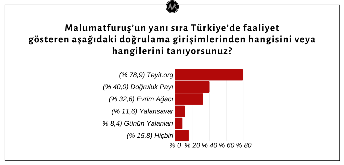 • Köşe yazarlarının Malumatfuruş’un yanı sıra Türkiye’de bilgi düzensizliğine karşı mücadele eden doğrulama girişimleri arasında en fazla aşina olduğu oluşum Teyit.org. Yazarların Teyit.org dışındaki doğrulama girişimlerinden pek haberdar olmadığı anlaşılmaktadır. Anket katılımcılarının % 15,8’i Türkiye’de faaliyet gösteren doğrulama girişimlerinden bihaber olduğunu belirtirken, aşina oldukları doğrulama girişimleri ve yüzdeleri şöyle sıralanmaktadır: Teyit.org (% 78,9), Doğruluk Payı (% 40), Evrim Ağacı (% 32,6), Yalansavar (% 11,6), Günün Yalanları (% 8,4), Dogrula.org (% 7,4)