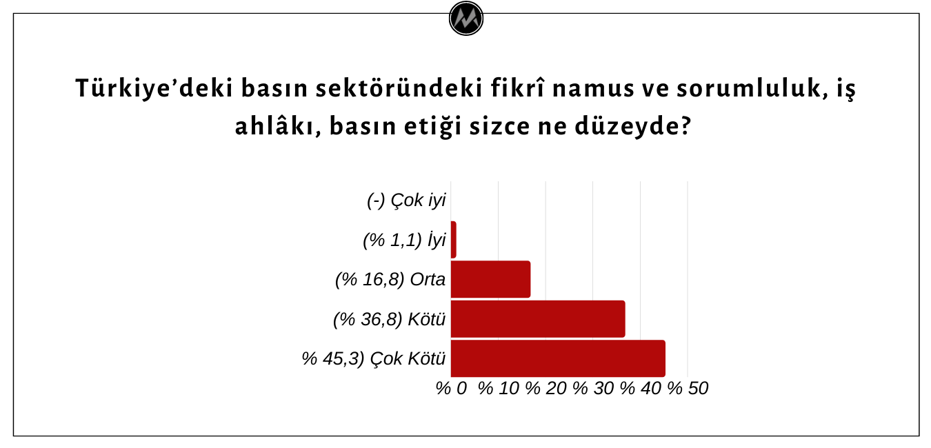 Son yıllarda özellikle yayınlarda, sahiplik yapısında ve aktarım formatında yaşanan köklü değişiklik yaşayan Türkiye’deki basın sektörü hakkında köşe yazarlarının görüşü oldukça menfi yönde. Ankete katılan yazarların sadece % 1,1’i Türkiye’deki basın sektöründeki fikrî namus ve sorumluluk, iş ahlâkı, basın etiğini “iyi” düzeyde değerlendirirken, % 16,8’i “orta” düzeyde görmekte olup, % 36,8’i “kötü”, % 45,3’ü “çok kötü” olarak nitelemektedir.