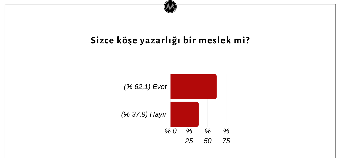 Ülkemiz basınında kökeni 19. yüzyılın ikinci yarısına değin uzanan köşe yazarlığının bir meslek olup olmadığı konusunda toplumda bir uzlaşı yok. Köşe yazarları arasında da sergiledikleri faaliyetinin bir meslek sayılıp sayılamayacağına dair görüş ayrılığı bulunduğunu görüyoruz. Anketimize katılan köşe yazarlarının % 62,1’i köşe yazarlığını bir meslek olarak değerlendirirken, % 37,9’u köşe yazarlığının bir meslek olmadığını belirtmiştir.