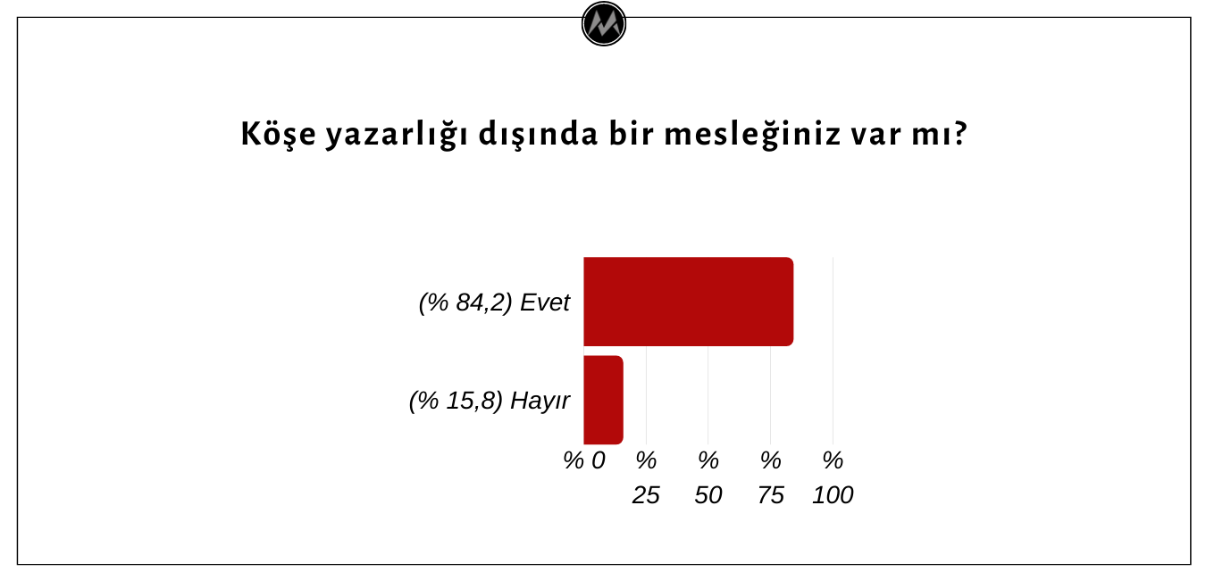 Her ne kadar katılımcıların % 37,9’u köşe yazarlığını bir meslek olarak belirtmemiş olsa da, anket sorularını yanıtlayan yazarların % 15,8’inin köşe yazarlığı dışında bir mesleğinin bulunmadığını belirttiği gözlemlenmiştir.