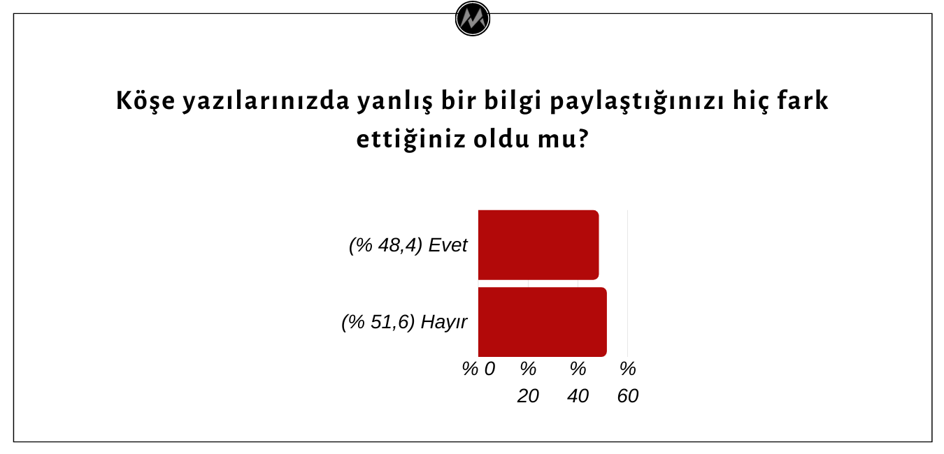 Yayınlanan yazılarında yanlış bir bilgiye yer verdiklerini fark edip etmediklerine yönelik soruya yazarların % 48,6’sının hatalı bilgi paylaştıklarını fark ettikleri, % 51,6’sının ise köşe yazılarında hatalı hiç bilgi paylaşmadıkları yönünde yanıt verdikleri görülmüştür.