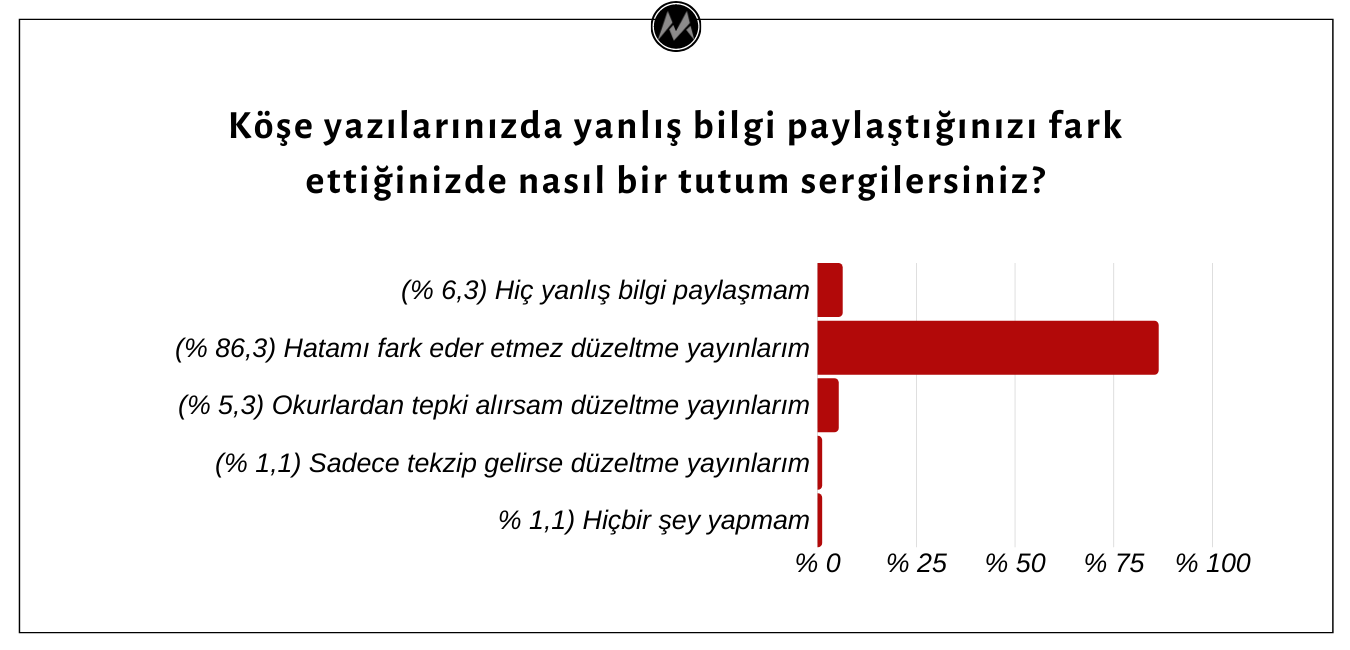 • Köşe yazılarında yanlış bilgi paylaştığını fark ettiklerinde izleyecekleri tutum hakkında ise köşe yazarlarının fiiliyatta gözlemleyemediğimiz yanıtlar verdiği görülüyor. Yazarların büyük çoğunluğu (% 86,3) hatalarını fark eder etmez okurlarından özür dileyerek düzeltme yayınladıklarını belirtmiştir. Yanıt verenlerin % 5,3’ü okurlardan tepki alırlarsa düzeltme yayınlayacaklarını, % 1,1’i ise sadece resmî tekzip geldiğinde düzeltme paylaşacağını aktarmıştır. İlginç şekilde katılımcıların % 1,1’i hatalı bilgi paylaşmış olsa da hiçbir şey yapmayacağını öne sürmektedir.