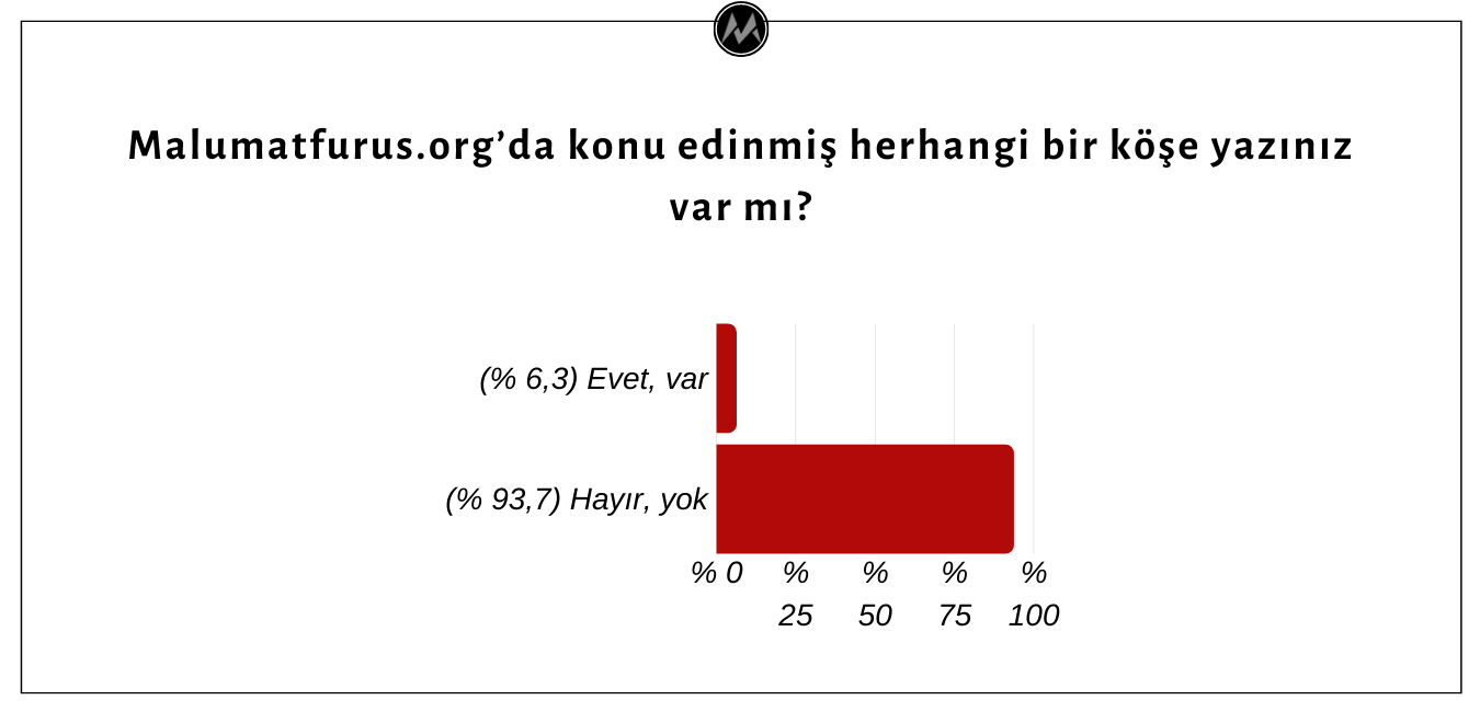 Her ne kadar Malumatfurus.org’da 1400 yazarın köşe yazısı konu edinmiş olsa da, hedef kitle araştırmasına katılan köşe yazarlarının sadece % 6,3’ünün sitede incelemeye konu edinmiş bir köşe yazısı bulunduğu, geriye kalan % 93,7’sinin bir yazısının konu edinmediğini belirttiği görülmüştür.