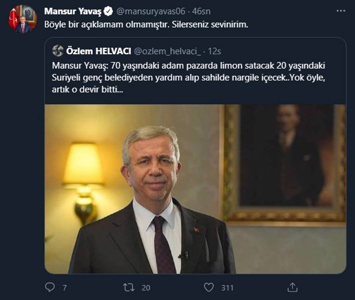 Yavaş’ın uyarısının ardından bahse konu sosyal medya kullanıcısı ilgili paylaşımını silmişti. Akabinde Yavaş’ın da Twitter hesabından “Böyle bir açıklamam olmamıştır. Silerseniz sevinirim.” ifadelerini içeren paylaşımının silindiği anlaşılıyor.