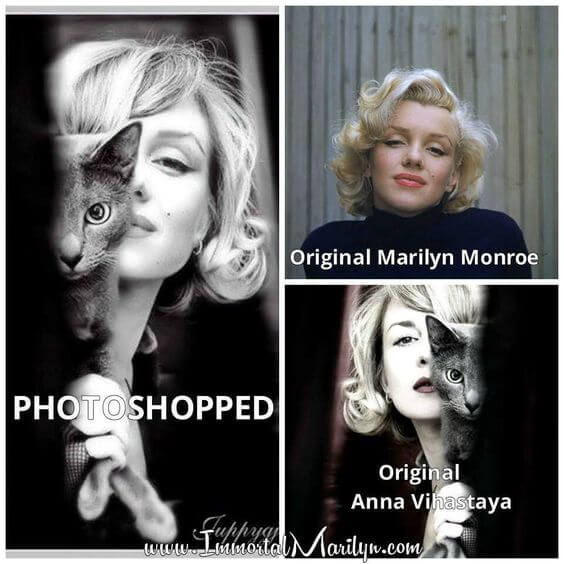 Marilyn Monroe’nun bir kedi ile birlikte poz verdiği ana ait sanılan fotoğraf ise, Monroe’nun 1953 yılında ABD’nin Los Angeles şehrindeki evinde çekildiği fotoğraf ile Anna Vihastaya’nın 2011 yılında 500px adlı siteye yüklediği fotoğrafının bileşimiyle oluşturulmuştu.
