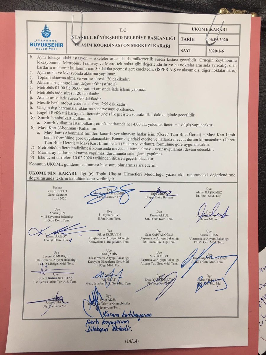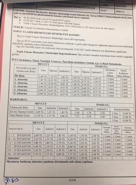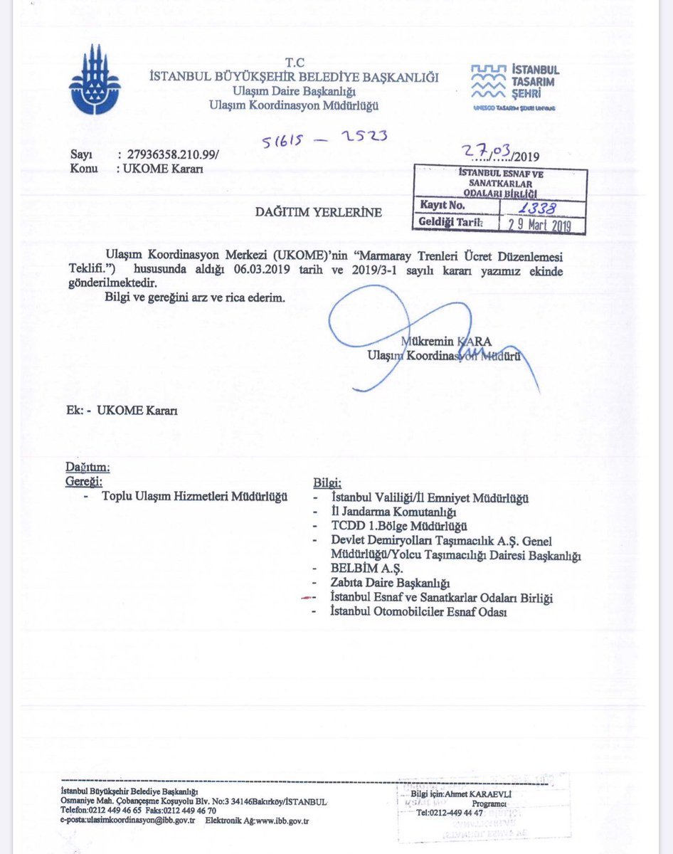 Marmaray trenleri ücret düzenlemesine ilişkin son alınan karara ilişkin imzaya sunulan UKOME karar taslağı incelendiğinde, Marmaray bilet zam teklifinin İBB’nin Toplu Ulaşım Hizmetleri Müdürlüğü değerlendirmesi çerçevesinde belirlendiği, Esnaf Odası temsilcisinin şerh düştüğü anlaşılıyor (İstanbul Büyükşehir Belediye Başkanı’nın başkanlık ettiği (ya da yerine vekil tayin edebildiği) UKOME, başkan hariç 21 üyeden oluşmaktadır. İmzaya sunulan belgede bazı isimlerin imzasının eksik olması, imza/paraf sunum sırasından kaynaklanmaktadır)
