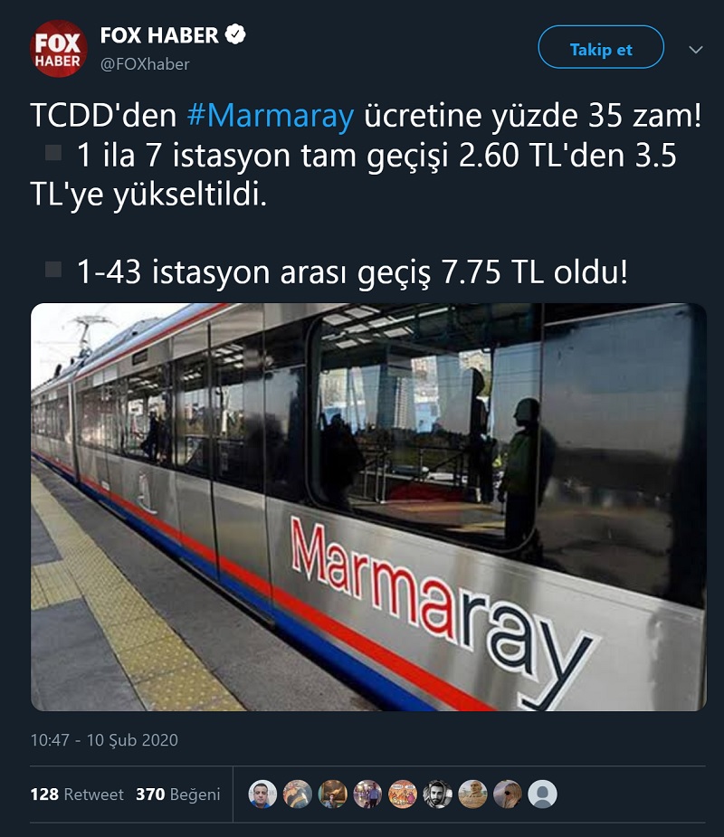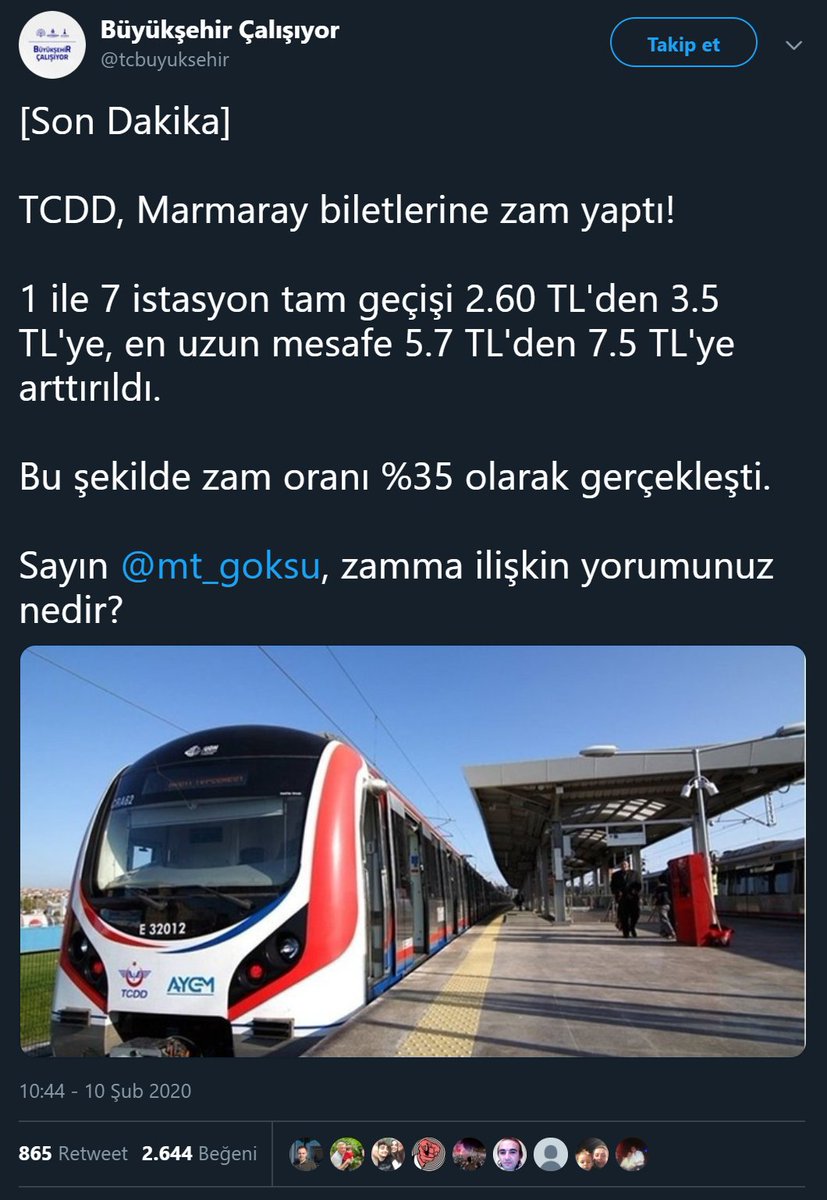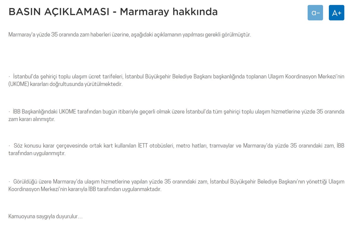 - Görüldüğü üzere Marmaray’da ulaşım hizmetlerine yapılan yüzde 35 oranındaki zam, İstanbul Büyükşehir Belediye Başkanı’nın yönettiği Ulaşım Koordinasyon Merkezi’nin kararıyla İBB tarafından uygulanmaktadır.