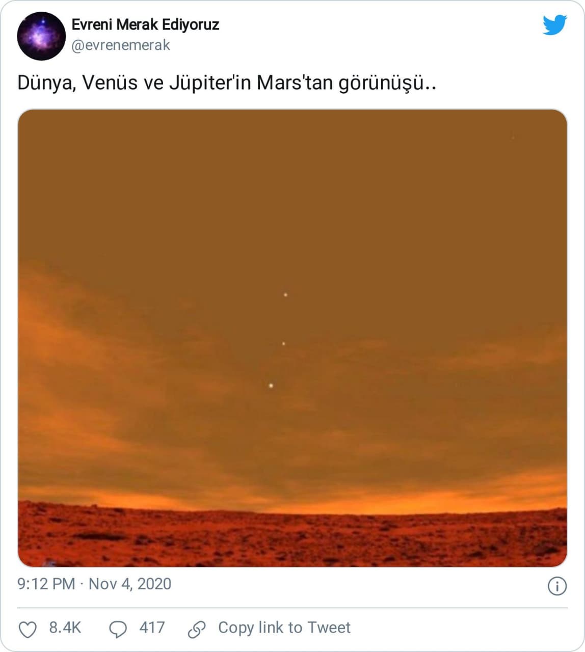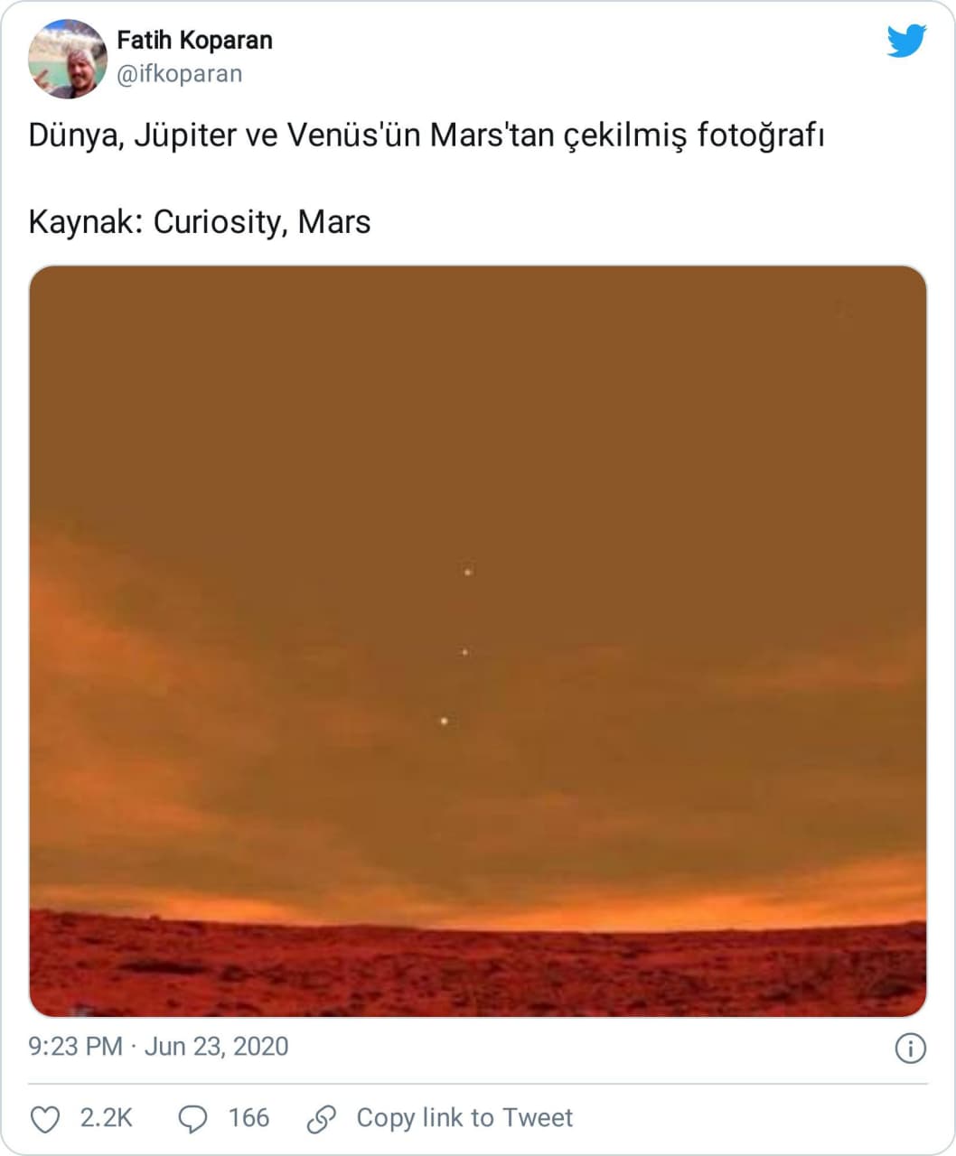 Sosyal medyada “Dünya, Venüs ve Jüpiter’in Mars’tan görünüşü” ya da “Dünya, Jüpiter ve Venüs’ün Mars’tan çekilmiş fotoğrafı” gibi notlarla paylaşılan ve NASA’nın Curiosity adlı uzay aracı kaynak gösterilen görseli konu edineceğiz.