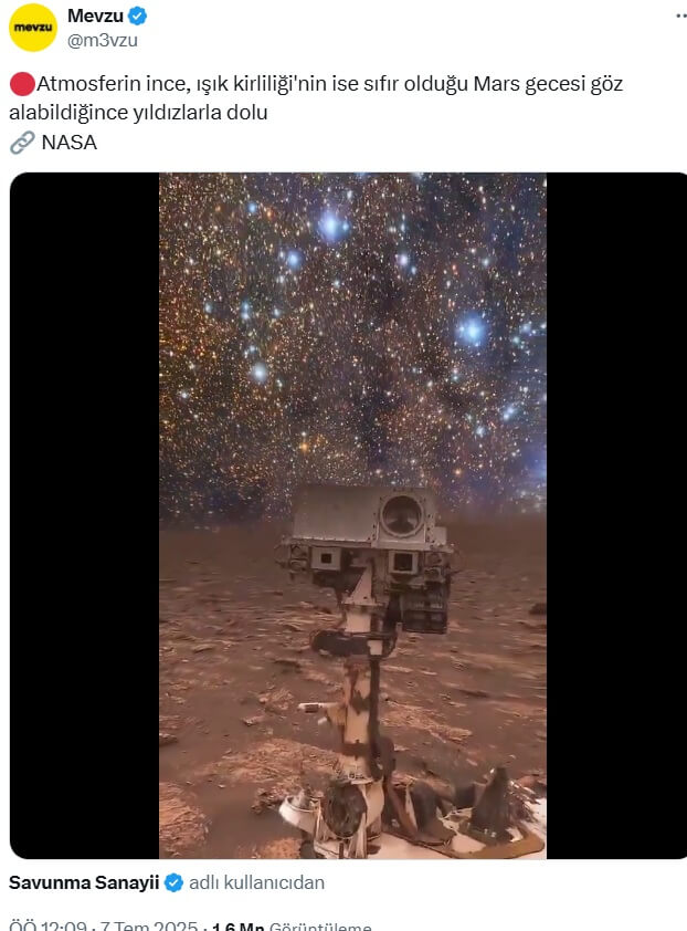Pars Plus (@Pars_Pluss): “Mars geceleri: Yıldızlar hiç bu kadar yakın olmamıştı ▫️ Mars’ta gökyüzü, Dünya’daki gibi sisli değil; atmosfer yok denecek kadar ince, ışık kirliliği ise sıfır. ▫️ Sonuç: Yıldızlarla dolu, keskin ve neredeyse gerçeküstü bir gece manzarası. Kaynak: NASA”