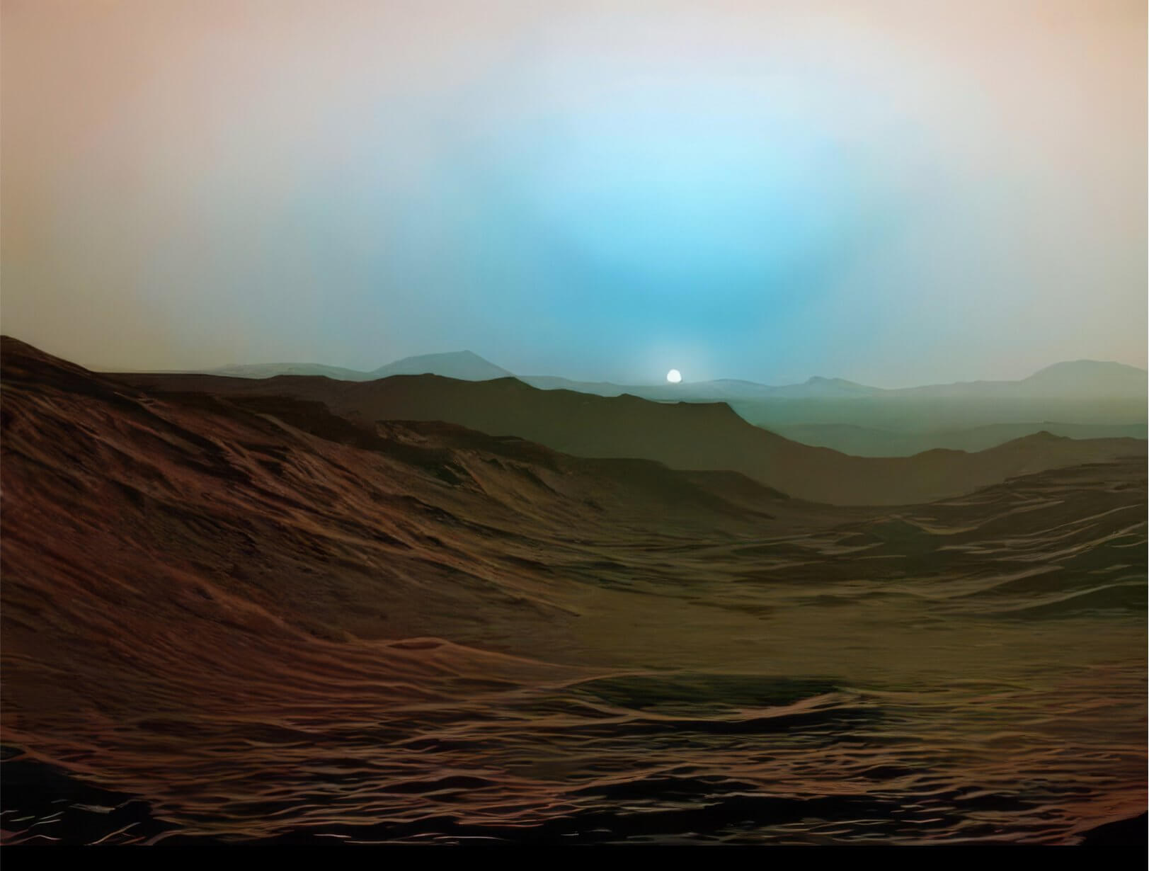 Dünya’daki gün batımından farklı bir fenomen olan Mars’ta Güneş batarken ortaya çıkan mavi renk de kızıl gezegenin atmosferik bileşenlerine bağlıdır.