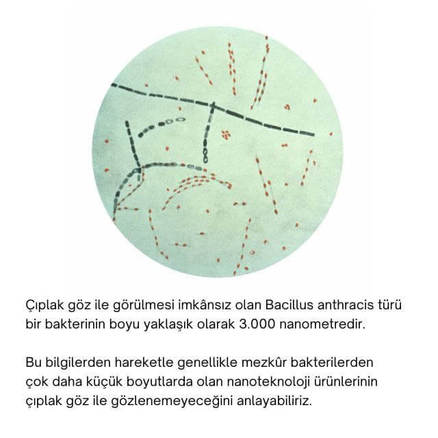 Öyle ki çıplak göz ile görülmesi imkânsız olan Bacillus anthracis türü bir bakterinin boyu yaklaşık olarak 3.000 (üç bin) nanometredir. Buradan da basit bir kıyas yaparak genellikle mezkûr bakterilerden çok daha küçük boyutlarda olan nanoteknoloji ürünlerinin çıplak göz ile gözlenemeyeceğini anlayabiliriz.
