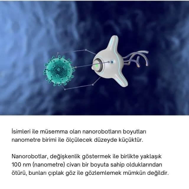 İsimleri ile müsemma olan nanorobotların boyutları nanometre birimi ile ölçülecek düzeyde küçüktür. Nanorobotlar, değişkenlik göstermek ile birlikte yaklaşık 100 nm (nanometre) civarı bir boyuta sahip olduklarından ötürü, bunları çıplak göz ile gözlemlemek mümkün değildir.