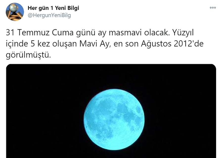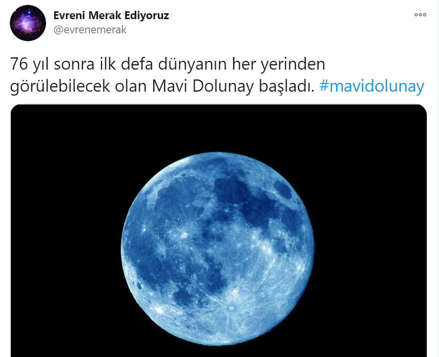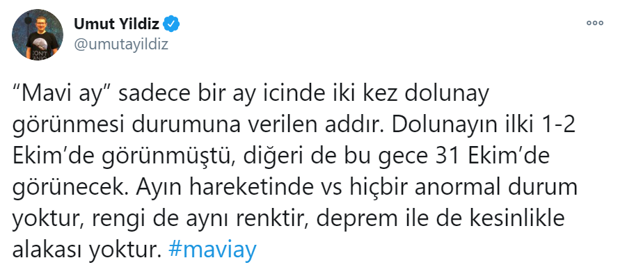 “‘Mavi ay’ sadece bir ay içinde iki kez dolunay görünmesi durumuna verilen addır. Ay’ın Dünya çevresinde synodic hareketi 29.5 gündür. Dolunayın ilki ay başında, diğeri de ay sonunda görünebildiği zamanlara denk gelebilirsiniz. Olur böyle şeyler, hayat işte. Yani Ayın hareketinde vs hiçbir anormal durum yoktur, rengi de aynı renktir, deprem ile de kesinlikle alakası yoktur. #maviay”