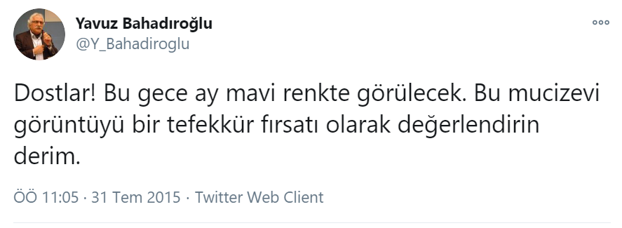 “Dostlar! Bu gece ay mavi renkte görülecek. Bu mucizevi görüntüyü bir tefekkür fırsatı olarak değerlendirelim derim.”