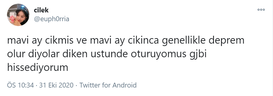 “Mavi ay çıkmış ve mavi ay çıkınca genellikle deprem olur diyorlar diken üstünde oturuyormuş gibi hissediyorum.”
