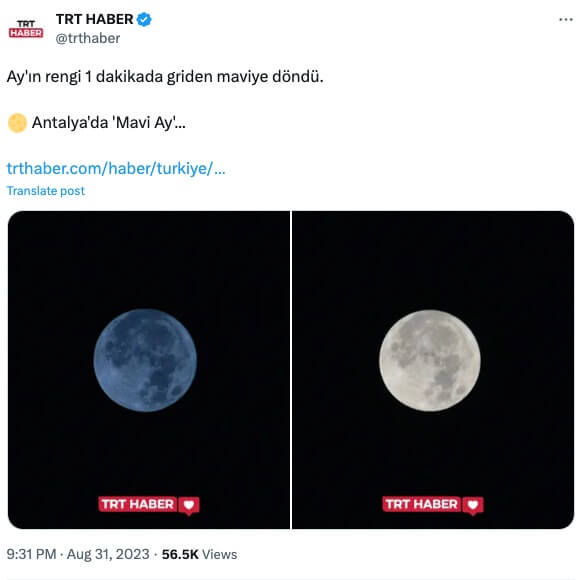31 Ağustos 2023 günü görülen Mavi Ay’ın ardından TRT Haber Ay’ın renginin 1 dakikada griden maviye döndüğünü ileri süren bir haber geçti: