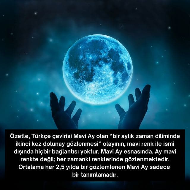 Özetle, Türkçe çevirisi Mavi Ay olan “bir aylık zaman diliminde ikinci kez dolunay gözlenmesi” olayının, mavi renk ile ismi dışında hiçbir bağlantısı yoktur. Mavi Ay esnasında, Ay mavi renkte değil; her zamanki renklerinde gözlenmektedir. Ortalama her 2,5 yılda bir gözlemlenen Mavi Ay sadece bir tanımlamadır.