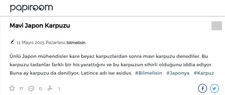“Ünlü Japon mühendisler, kare beyaz karpuzlardan sonra mavi karpuzu denediler. Bu karpuzu tadanlar farklı bir his yarattığını ve bu karpuzun sihirli olduğunu iddia ediyor. Buna ay kapuzu deniyor. Latince adı ise asidus.”