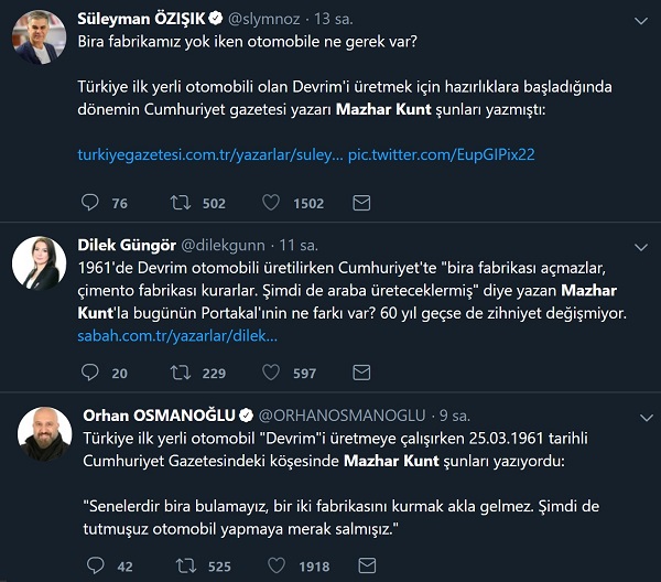 Bu süreçte sosyal medyada ve birçok köşe yazısında Cumhuriyet Gazetesinde 1960’lı yıllarda yazılar kaleme alan Mazhar Kunt’un devrim arabalarının yapımı sürecinde bira fabrikası ile otomobil fabrikasını kıyas ettiğine ilişkin bir iddia dolaşıma girdi. Mazhar Kunt’un yazısı üzerinden yerli otomobile 60 yıl önce de karşı çıkanların varlığının işaret edildiği paylaşımlarda “60 yıl geçse de zihniyet değişmiyor” vurgusunda bulunulmuştu.
