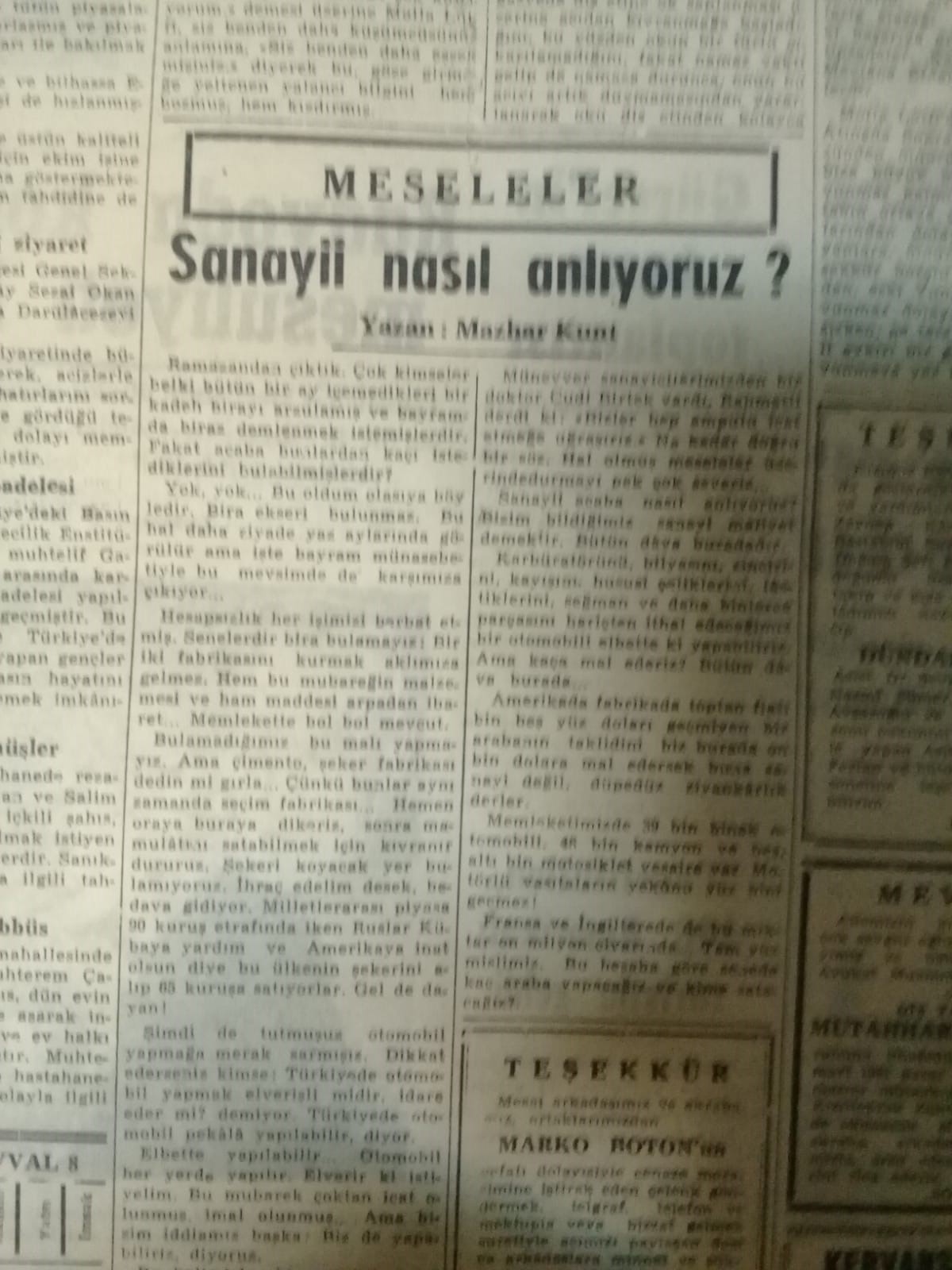 Mazhar Kunt'un Cumhuriyet Gazetesindeki 25 Mart 1961 tarihli "Sanayii Nasıl Anlıyoruz" başlıklı yazısı