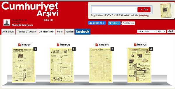 Cumhuriyet Gazetesinin 25 Mart 1961 tarihli nüshasının ilk 2 sayfası dijital arşivlerinde görülemiyor