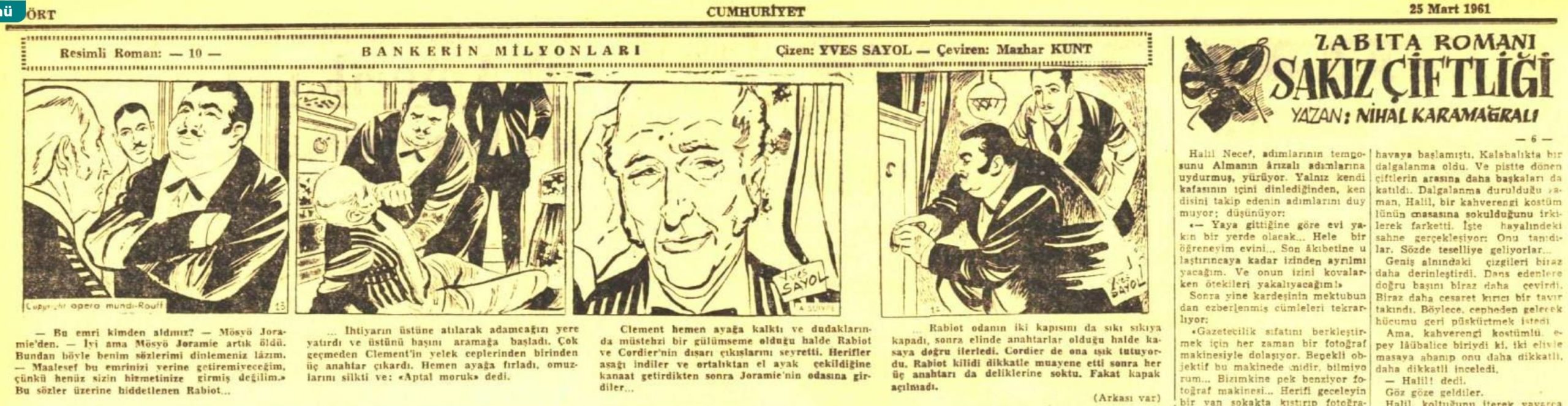 Cumhuriyet Gazetesinin 25 Mart 1961 tarihli baskısında yer alan Mazhar Kunt'un Yves Sayol'un Bankerin Milyonları adlı resimli romanına dair çevirisi