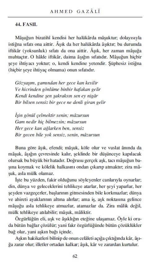 “Senin gönlün dâima meshûr ve müsahhardır, mâzursun / Gamın ne olduğunu aslâ bilmedin, mâzursun / Ben sensiz bin gece kan yuttum / Sen bir gece sensiz kalmadın, mâzursun” dizelerini içeren “Mâzursun” adıyla bilinen şiiir Ahmed Gazâlî’ye ait