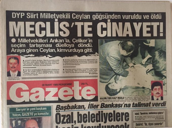 30 Mart 1989 tarihinde ise Bağımsız Siirt Milletvekili Zeki Çeliker ile ANAP Siirt Milletvekili İdris Arıkan arasında yerel bir siyasi sorun nedeniyle çıkan kavgayı ayırmaya çalışan DYP Siirt Milletvekili Mehmet Abdurrezak Ceylan yaşamını yitirdi. Yapılan incelemede Ceylan’ın İdris Arıkan’ın silahından çıkan kurşunla öldüğü belirlendi. Arbedede çektiği silahtan çıkan kurşunla Abdurrezak Ceylan’ın ölümüne neden olan Arıkan, bu olayın ardından yargılanıp mahkum oldu, 13 ay hapis yattı ve milletvekilliği düştü.