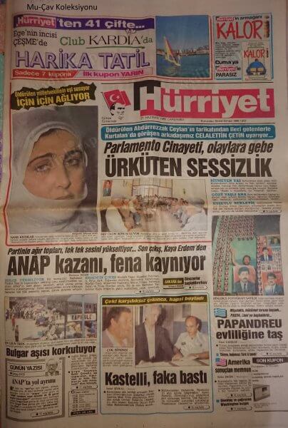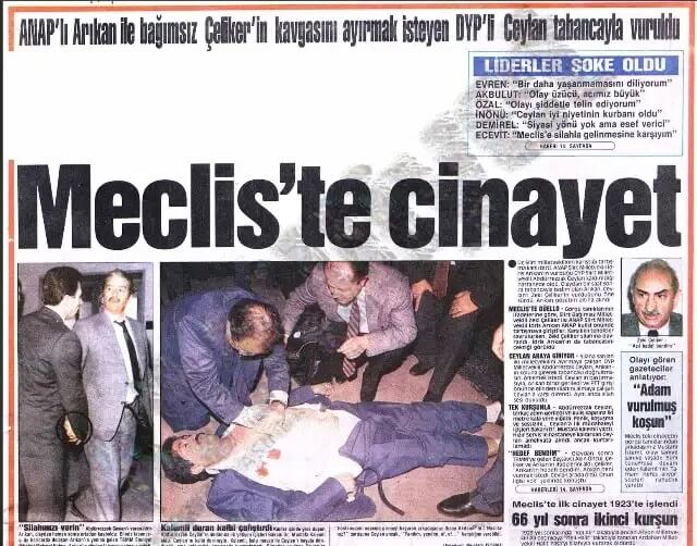 “Oturum açılınca muhalefet milletvekilleri yine kürsüye yürüyerek, Divan kâtibinin mikrofonunu çekti. Buna DSP’li ve MHP’li milletvekilleri tepki göstererek muhalefet milletvekillerinin üzerine yürüdü. Bu sırada MHP ile DYP milletvekilleri arasında kürsünün önünde yumruklaşma başladı. DYP Şanlıurfa milletvekili Fevzi Şıhanlıoğlu ile MHP’li milletvekilleri Mehmet Kundakçı, İsmail Çevik, Cahit Tekelioğlu, Cumali Durmuş birbirlerine kıyasıya yumruk atmaya başladı.