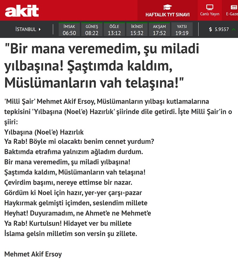 Mehmet Akif Ersoy’a ait sanılan tepkisel “yılbaşı şiiri”ni içeren Yeni Akit haberi