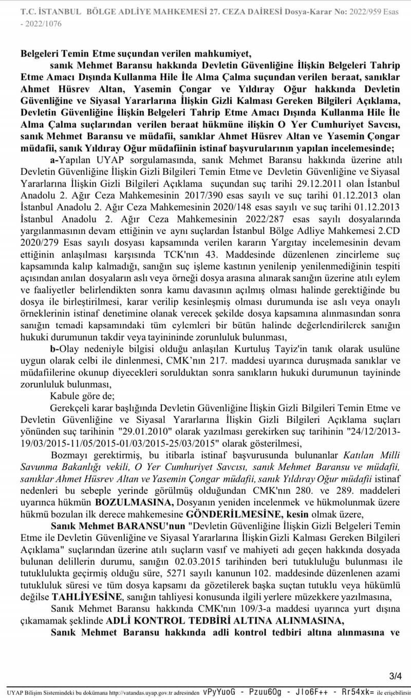 “Mehmet Baransu hakkında verilen Bozma ve Tahliye Kararına çok itiraz gelse de Bölge Adliye Mahkemesi yanlış birşey söylemiyor. Mahkumiyet Kararı hatalı demiyor. Bazı usul eksiklikleri var bunları gider diyor. Tahliye Kararı ise Yurt Dışına Çıkış Yasağı’na bağlanıyor.