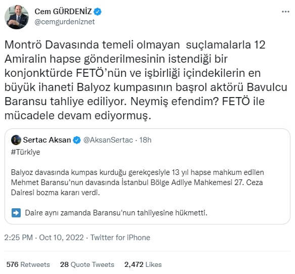Cem Gürdeniz: “Montrö Davasında temeli olmayan suçlamalarla 12 Amiralin hapse gönderilmesinin istendiği bir konjonktürde FETÖ’nün ve işbirliği içindekilerin en büyük ihaneti Balyoz kumpasının başrol aktörü Bavulcu Baransu tahliye ediliyor. Neymiş efendim? FETÖ ile mücadele devam ediyormuş.”